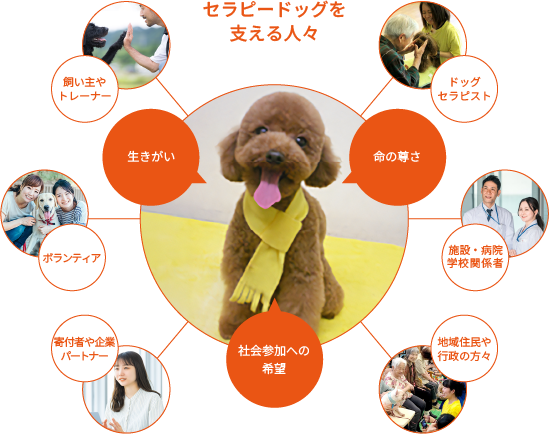 この図は、私たちの活動の核である【セラピードッグ】を中心に、犬と人との触れ合いから生まれるかけがえのない価値と、それを支え、広げていく全ての人々の「支援の輪」を表しています。