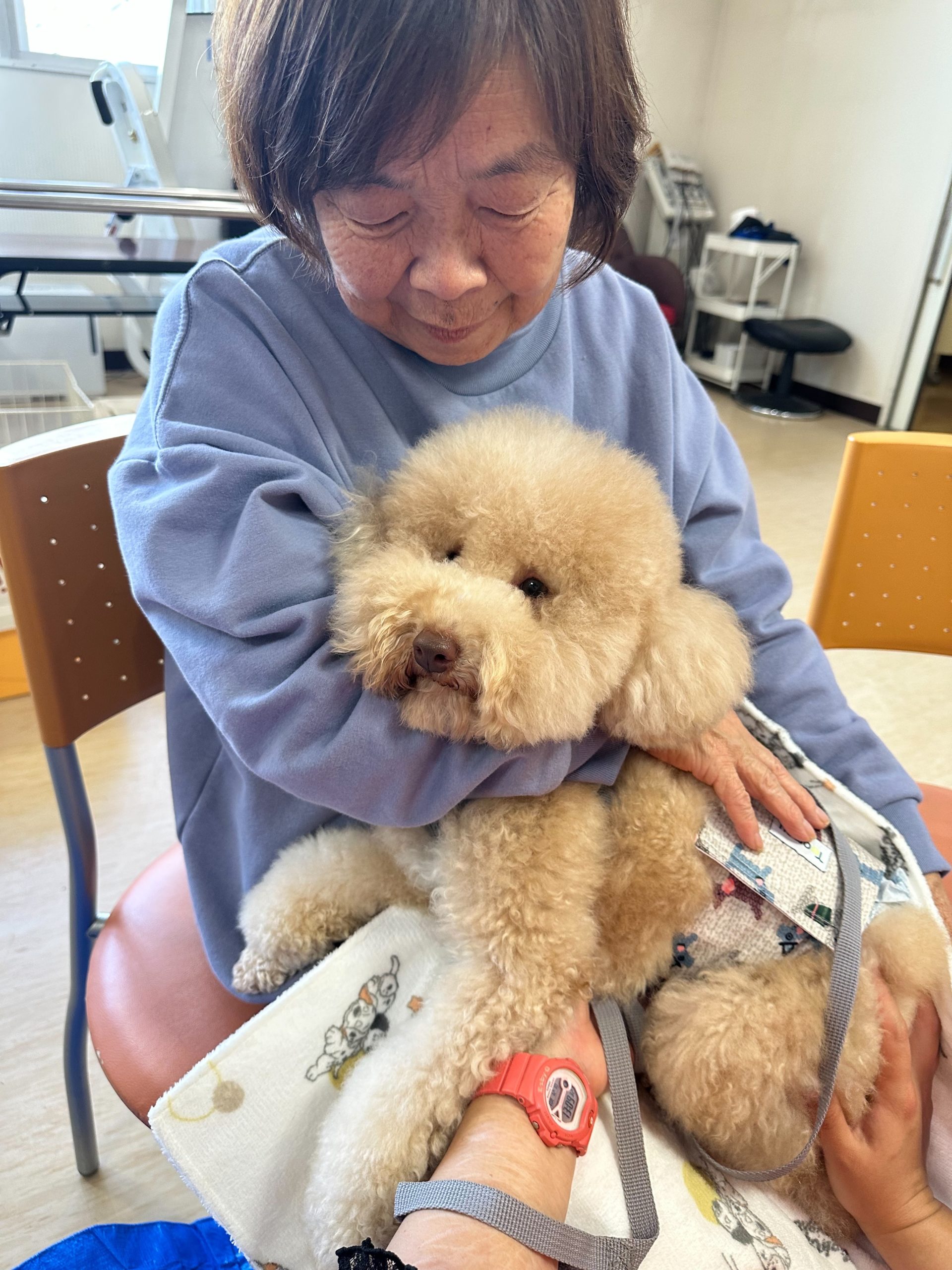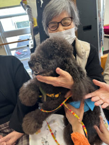 まずはお一人ずつ、膝の上にワンちゃんたちがご挨拶に伺います。利用者様はトイプードルのモコモコした毛並みを撫でてくださったり、そっと抱きしめてくださったり…🥰 その時の表情は本当に穏やかで、まるで長い間会っていなかった孫に再会したかのような、愛情に満ちた笑顔が溢れていました。