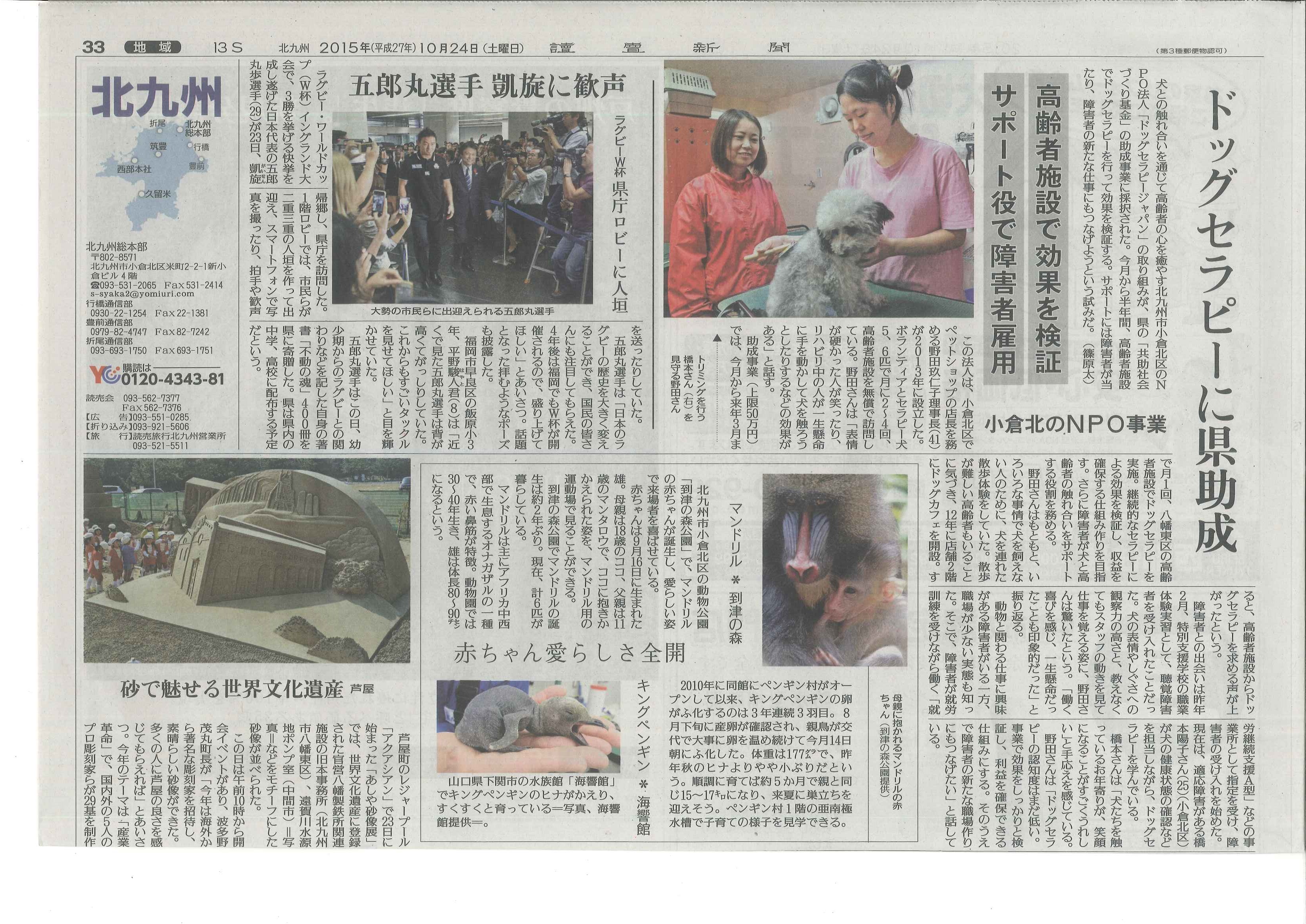福岡県の 「共助社会づくり基金」に採択され 北九州市八幡東区にあるシニアコート八幡さんの協力を得て、 10月から毎月、お年寄りにドッグセラピーを実施して  …