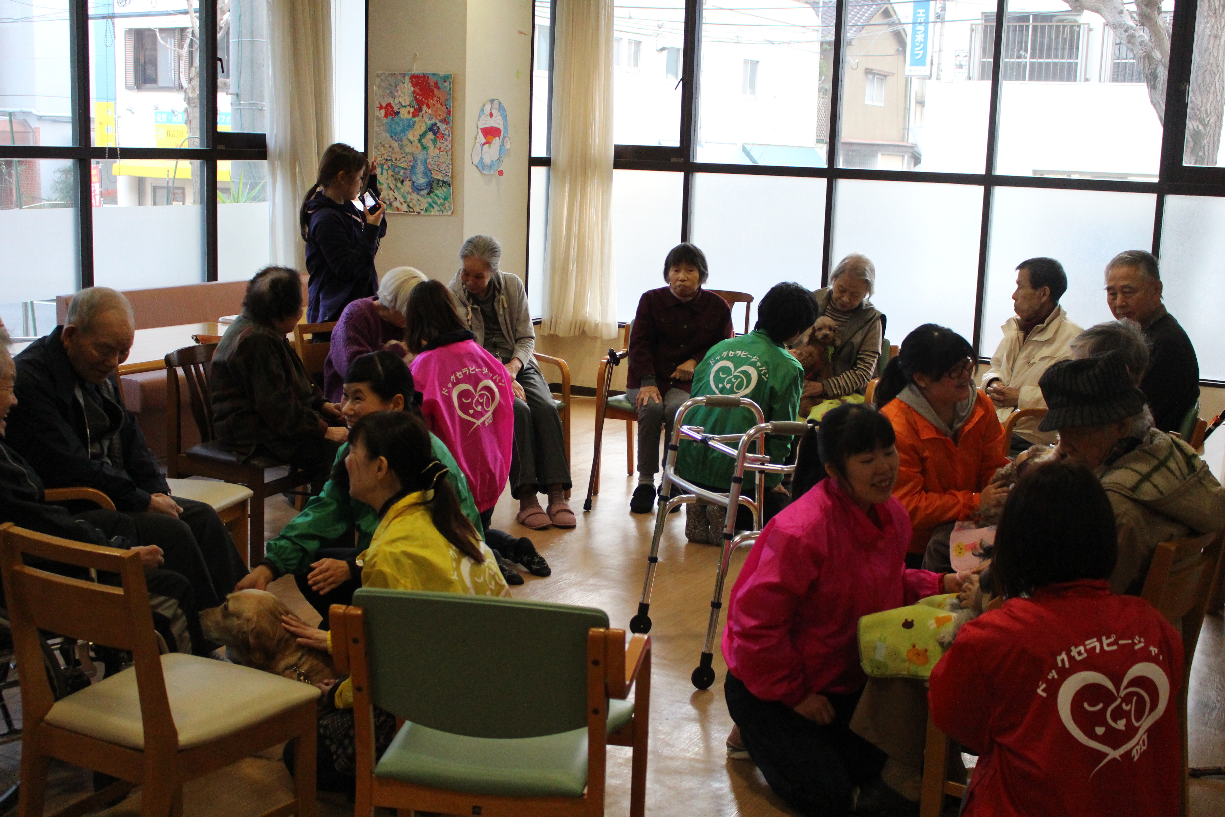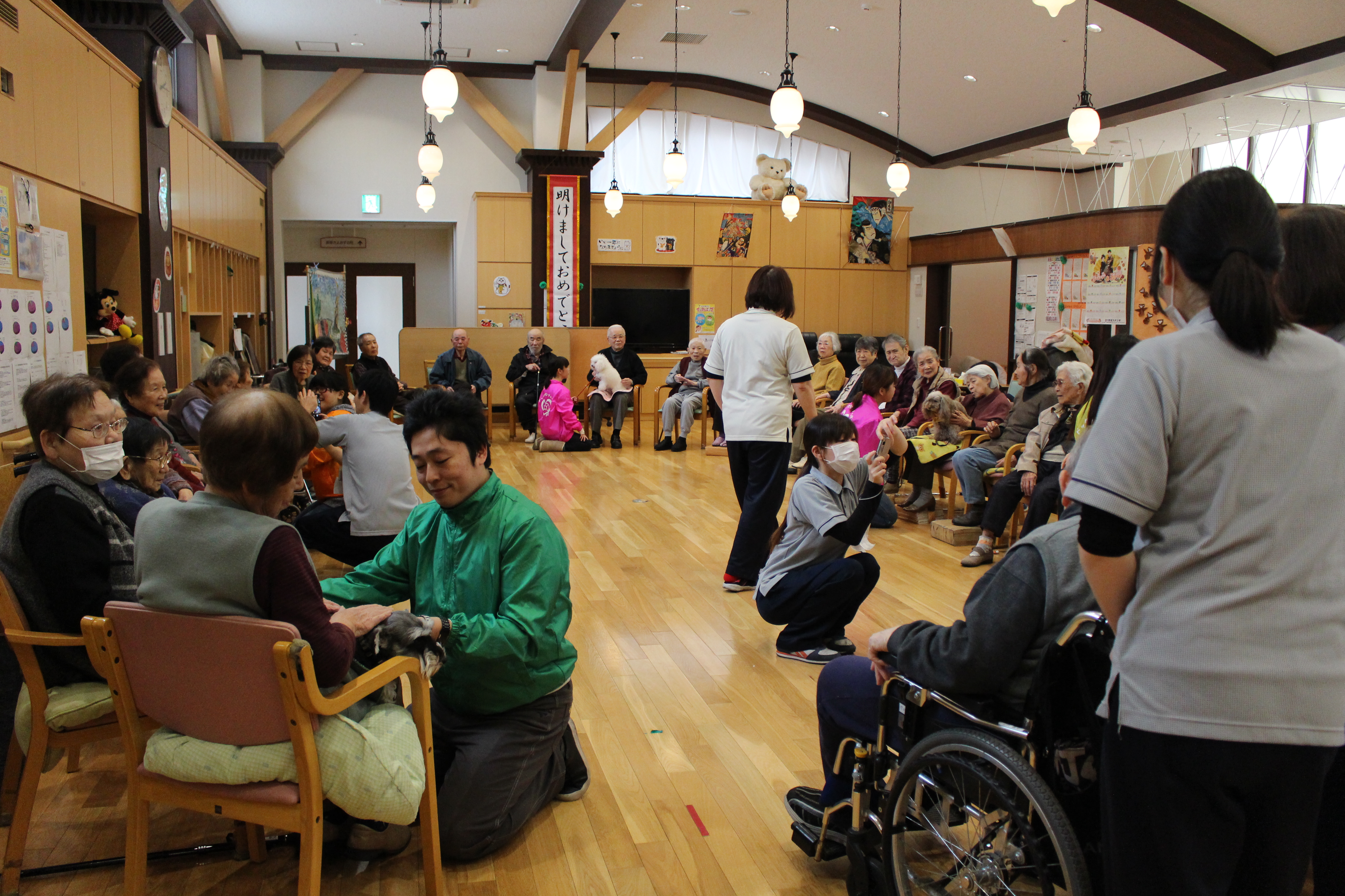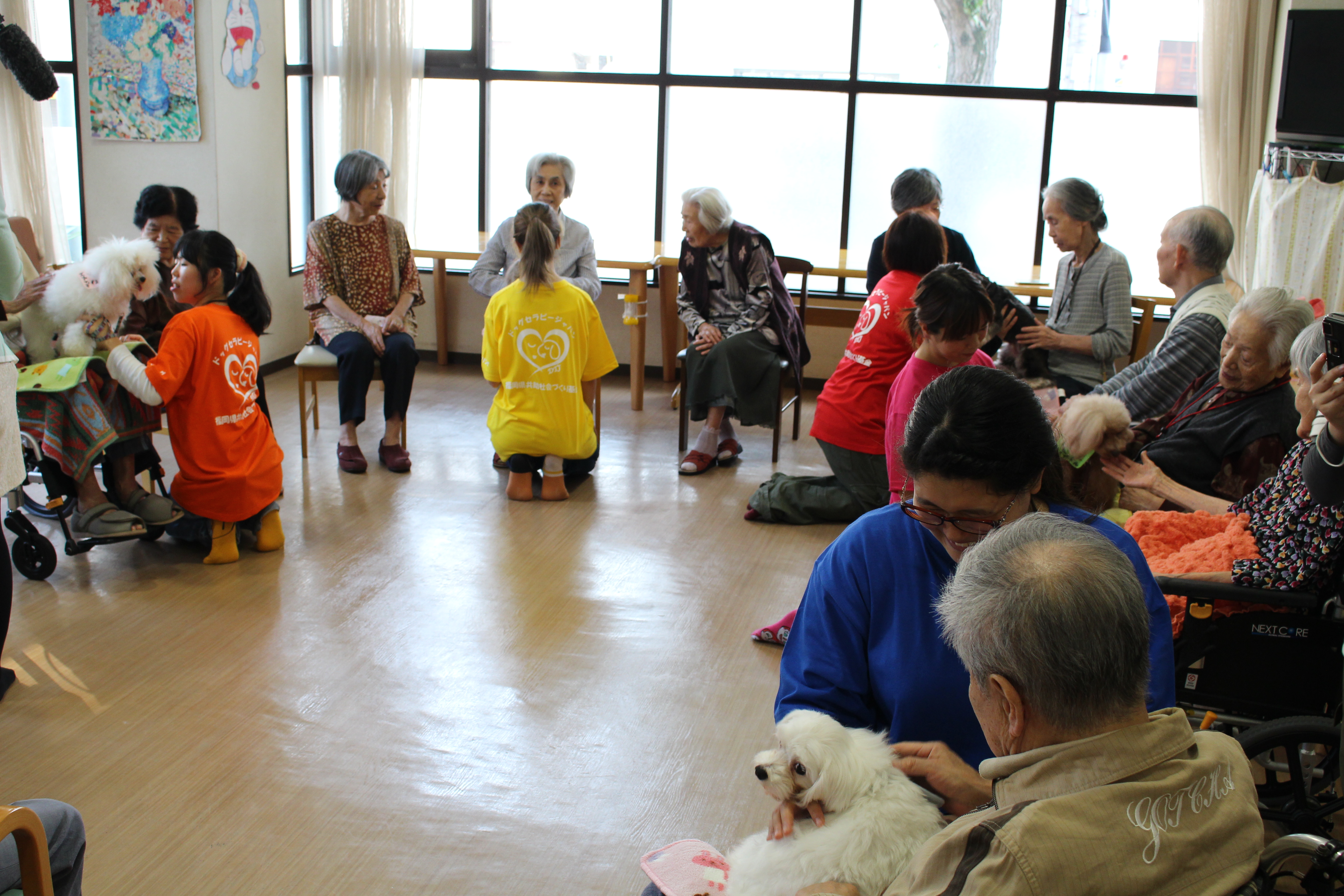 小倉北区東篠崎にある 住宅型有料老人ホーム 四季の郷 小倉 ドッグセラピー活動を行ってきました おそろいのユニフォームを着てのスタート 今回は、40人位のお年寄りが…