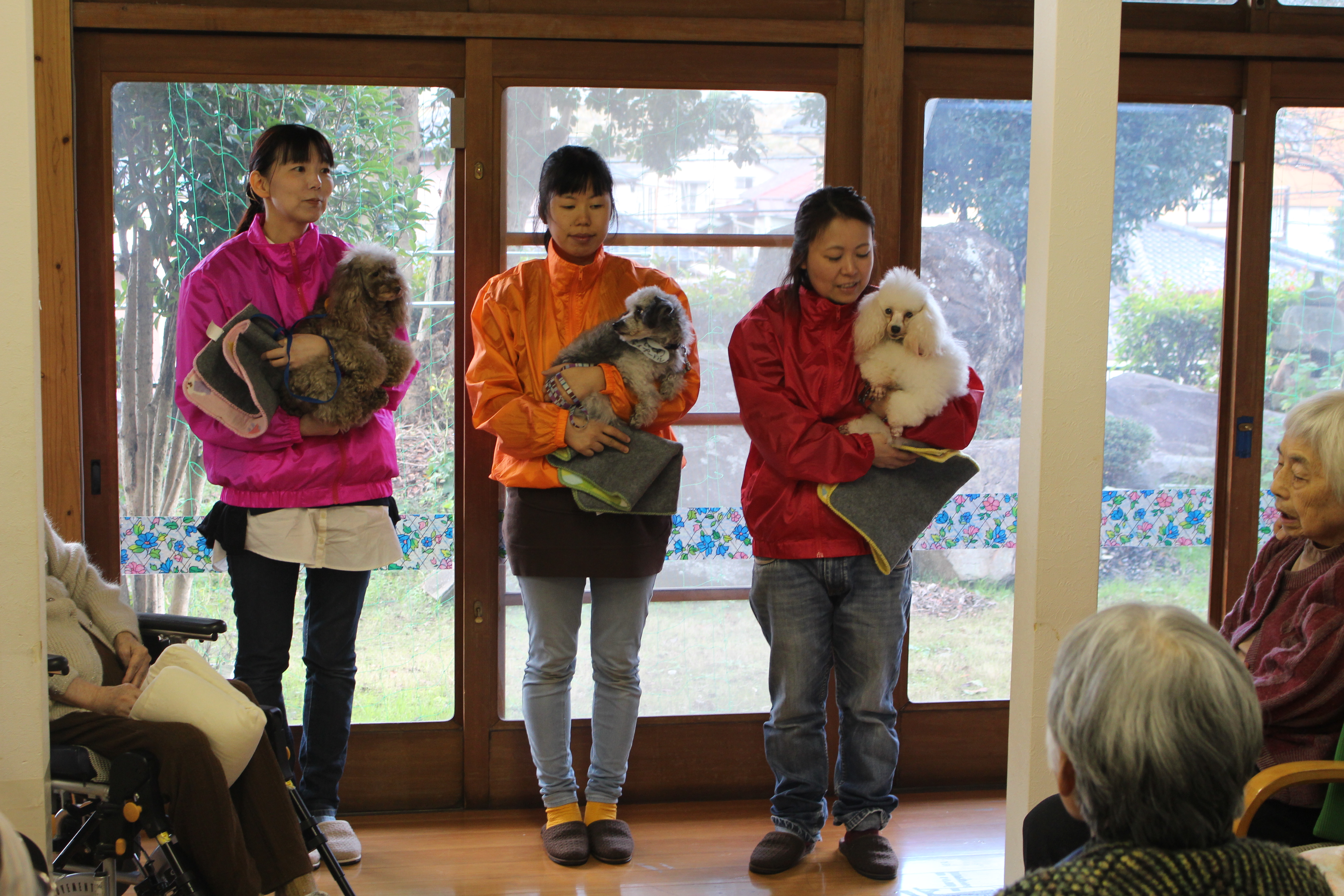 北九州市八幡東区にある 《介護対応型》高齢者専用住宅 シニアコート八幡にて ドッグセラピー活動を行ってきました それぞれのカラーの違うジャンバーを着こなし スタート♪  …