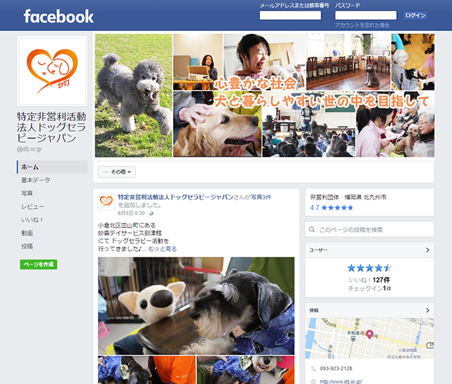ドッグセラピージャパンでは、フェイスブックやツイッターなどSNSの活用を通じ活動内容を広め、
